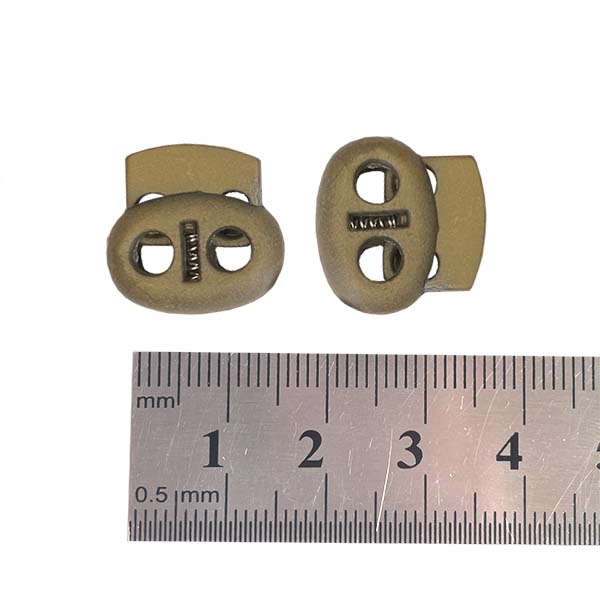 Фиксатор для шнурка овальной формы на два отверстия. Конструкция с пружинным механизмом и кнопкой позволяет стопору фиксировать положение шнура или резинки (эластичного шнура) в изделии. Такие зажимы используют в капюшонах, манжетах. Ими регулируют длину, низ изделия или линию талии.